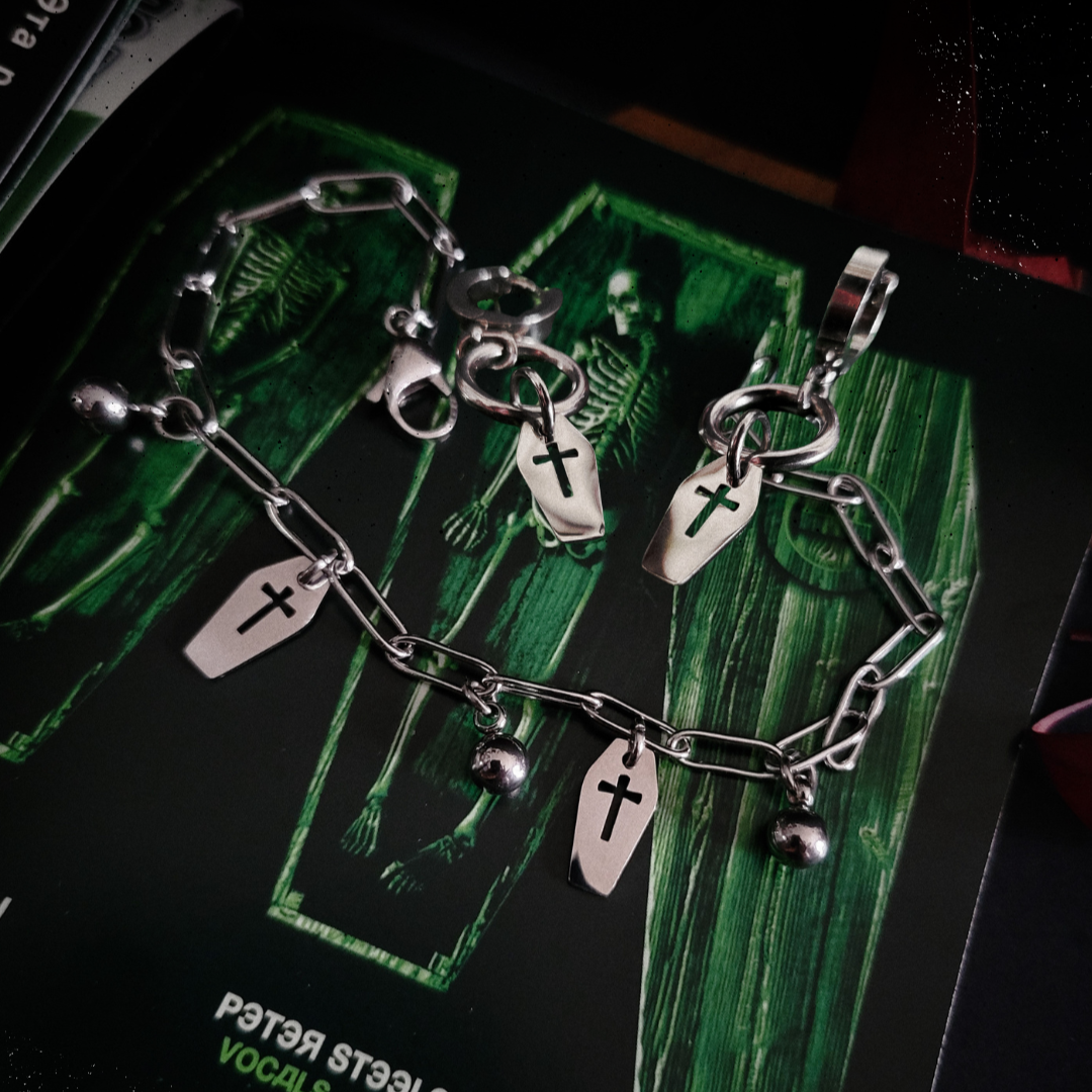 Death Crypt Jewelry uses a variety of metal materials which are listed in each item description. These metals may naturally tarnish or show signs of wear overtime; so it is especially important to practice proper care and storage of your jewelry. The best way to store each jewelry piece is in a small ziplock then into a cool closed case or pouch. Jewelry should be cleaned often and gently with a polishing cloth.