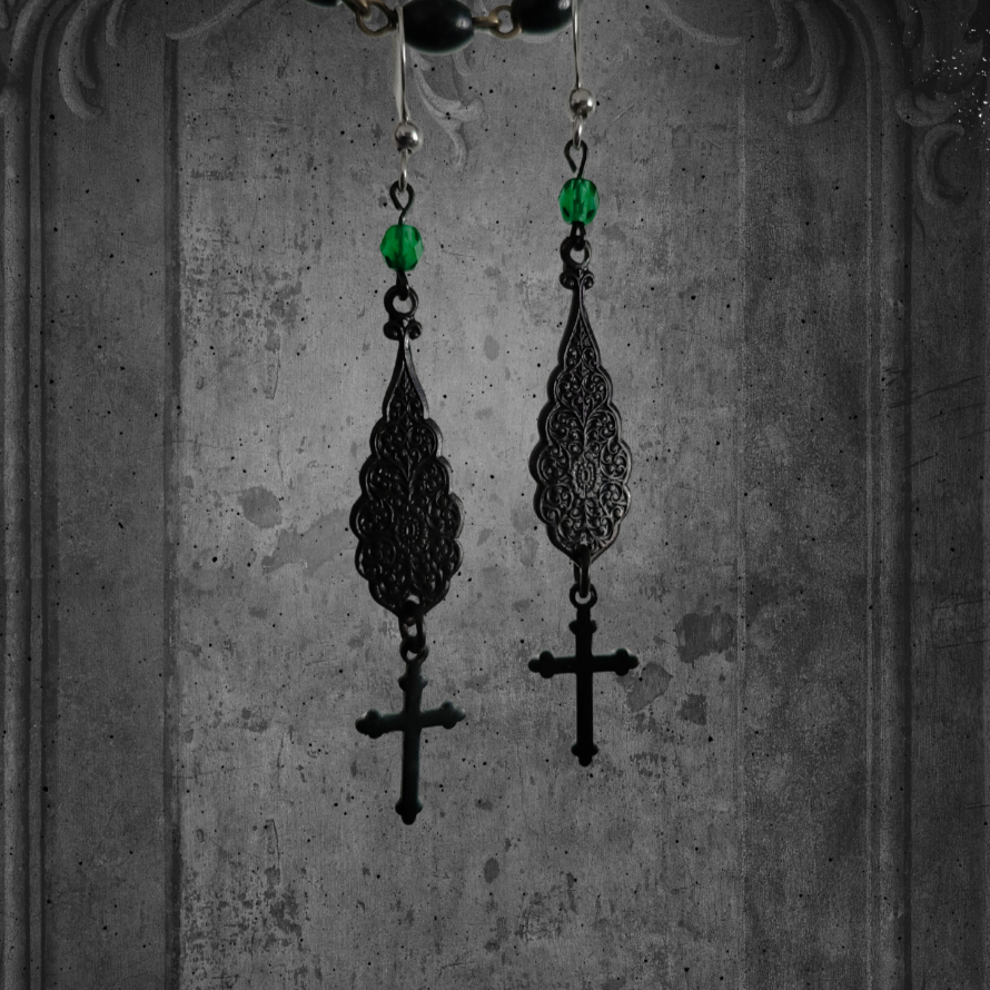 All black earrings with green rosary beads and silver stainless steel hooks.