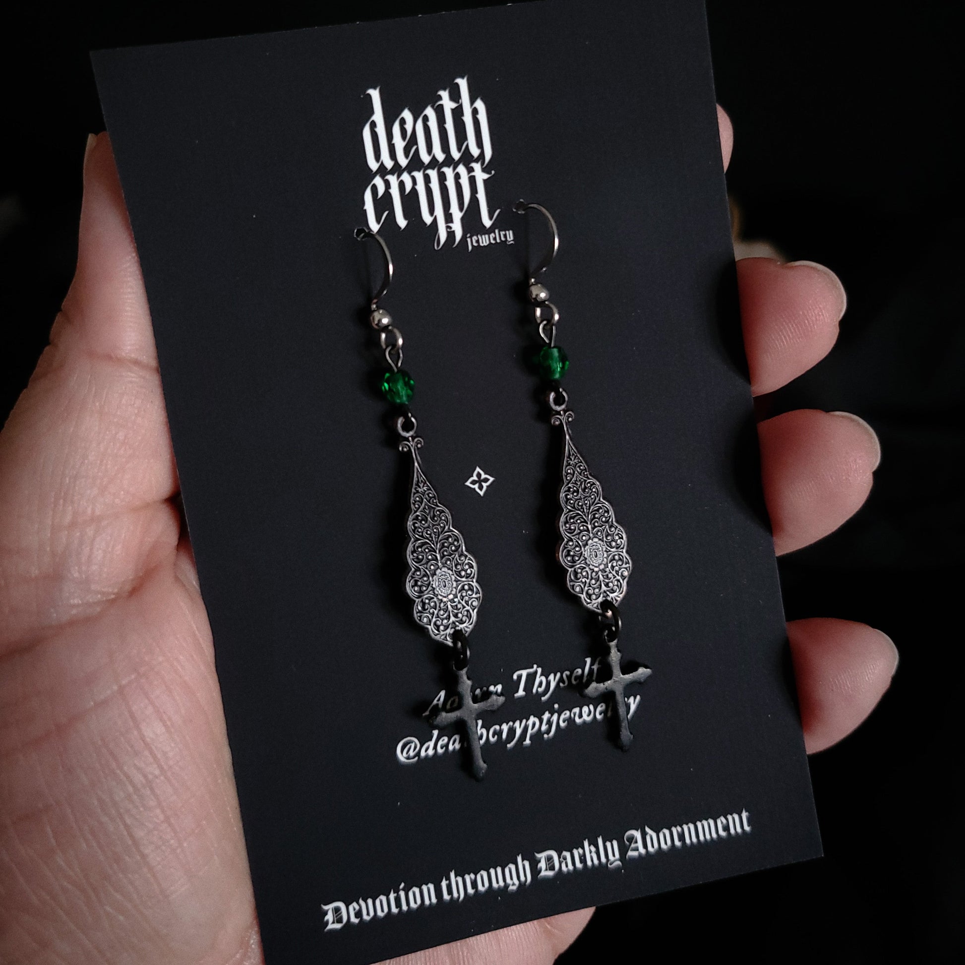 Death Crypt Jewelry uses a variety of metal materials which are listed in each item description. These metals may naturally tarnish or show signs of wear overtime; so it is especially important to practice proper care and storage of your jewelry. The best way to store each jewelry piece is in a small ziplock then into a cool closed case or pouch. Jewelry should be cleaned often and gently with a polishing cloth.