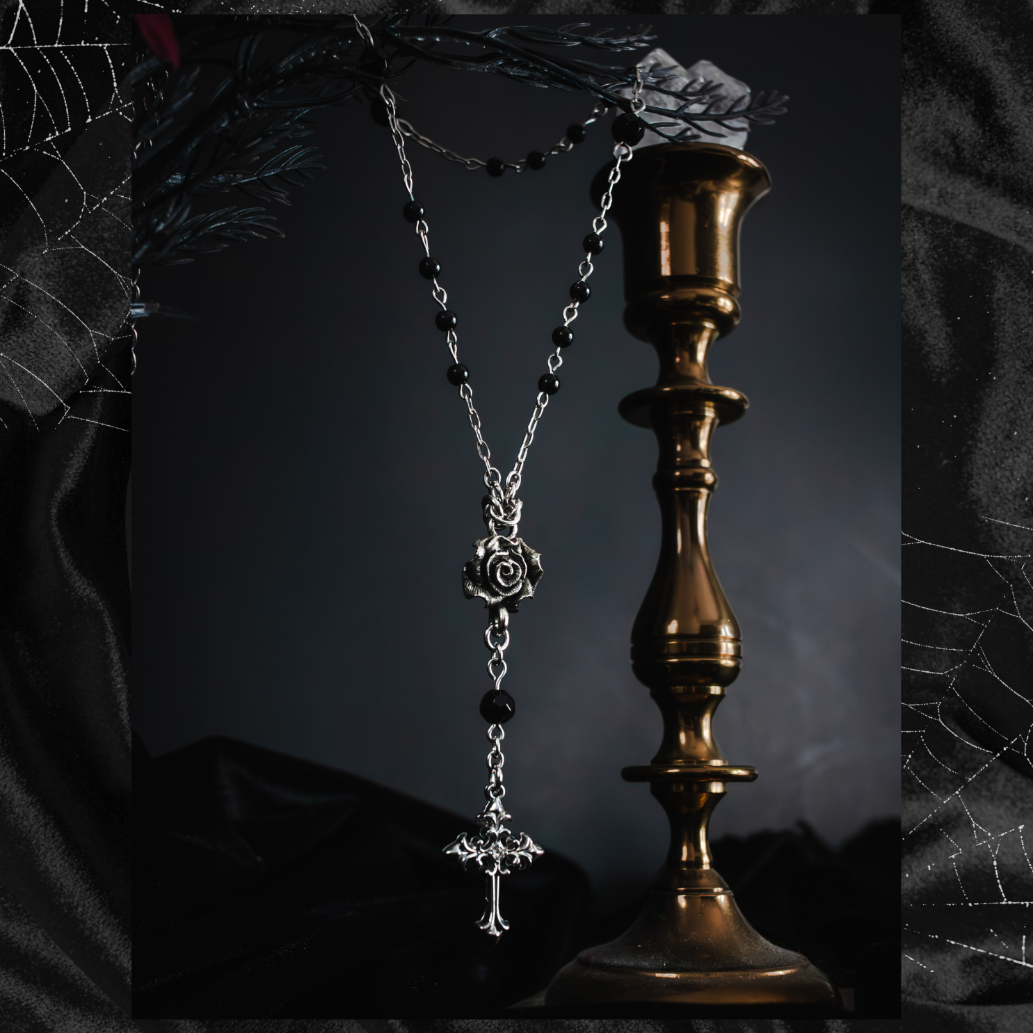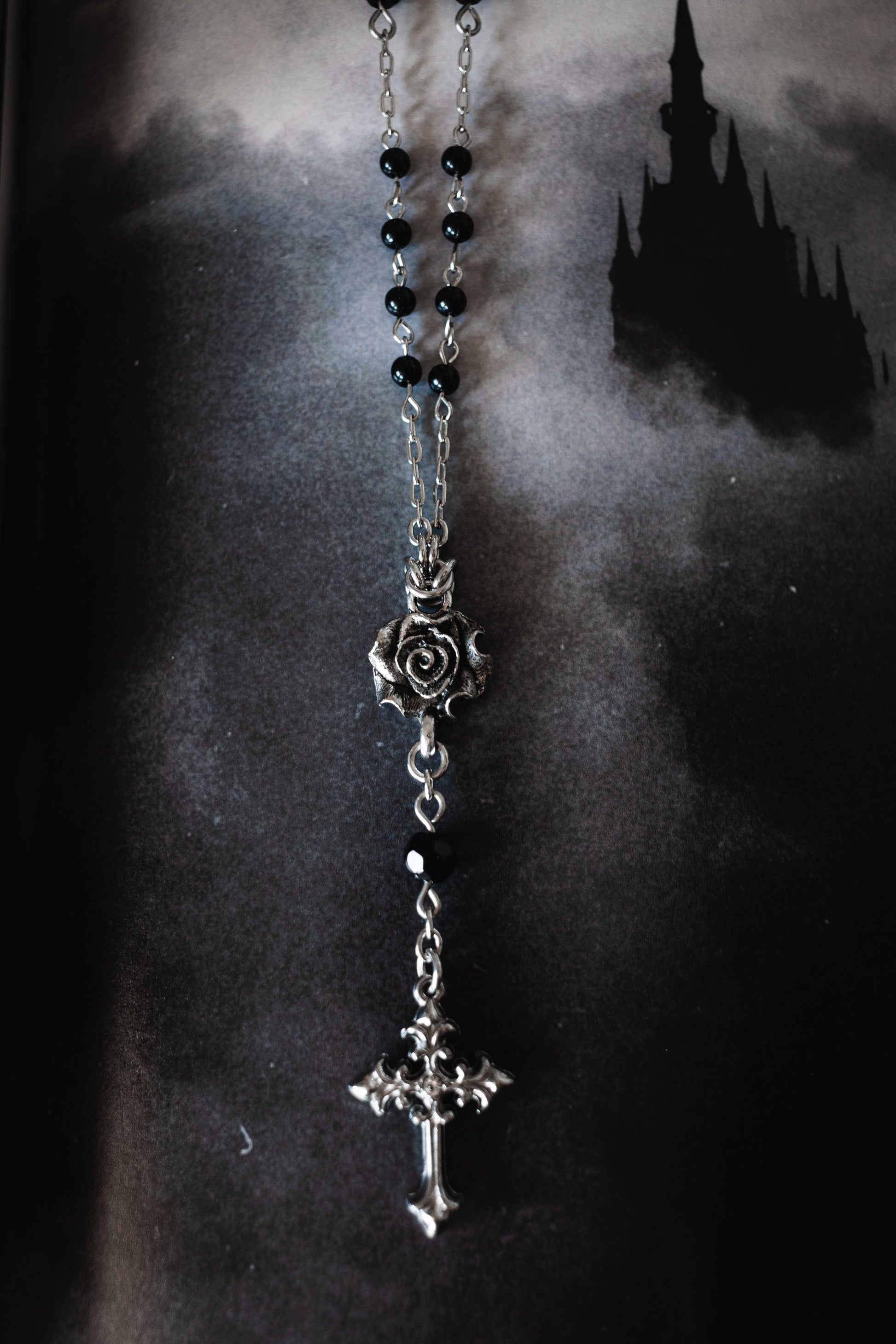 Note: Rose (pewter) centerpiece is three dimensional; Cross (stainless steel) pendant is flat-back.